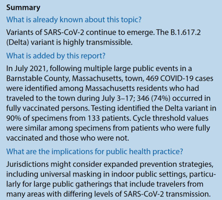 CDCの調査では、マサチューセッツ州の住民のうち、2週間の間に屋内外の公共の集まりに参加した469例に焦点を当てました。その結果、ワクチンを接種した住民のうち346人がCovid-19とされる症状を呈し、そのうち74%がCovid-19症状を呈し、1.2%が入院していることがわかりました。