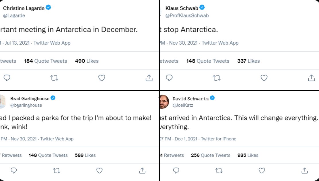 興味深いこのスレッドでは、「グレート・リセット」の提唱者であるクラウス・シュワブを含む多数のグローバリストたちが、最近、南極で行われている非常に重要な会議をほのめかしたと言われており、ある参加者がそれをツイートしていることがわかります。「南極?これはすべてを変えるだろう。すべてが。」