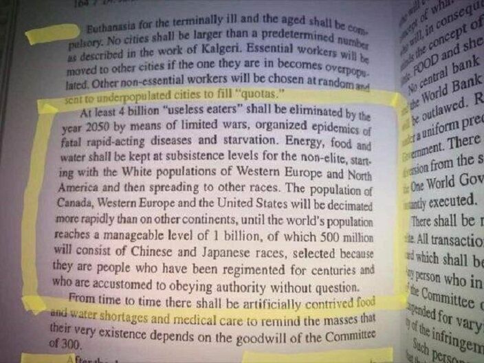 2050年までに少なくとも40億人の無駄飯食いを、限定戦争、致死性速効性疾患の組織的流行、飢餓などの手段で駆逐する。エネルギー、食糧、水は、非エリートのために、自給自足のレベルに保ち、白人の西ヨーロッパと北アメリカから始まり、他の人種に広がっていくものとする。カナダ、西ヨーロッパ、アメリカの人口は、他の大陸よりも急速に減少し、世界の人口が管理可能な10億人のレベルに達するまで、そのうちの5億人は中国人と日本人になるだろう。彼らは、何世紀にもわたって体制を整え、疑問なしに権威に服従することに慣れている人々であるために選ばれたのだ。時折、人為的に仕組まれた食糧や水不足、医療不足が発生し、大衆に自分たちの存在が300人委員会の善意に依存していることを思い知らせることになる。