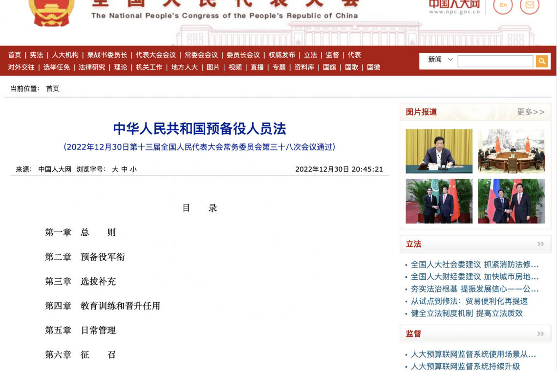 中国共産党(CCP)は、2023年3月1日に施行される予備役兵役法を静かに可決した。18歳以上であれば、国防動員が発表された後、誰でも入隊することが義務付けられている。