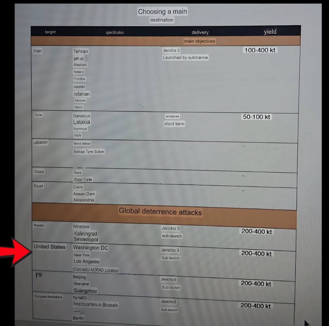 イスラエルのサムソン・オプションが明らかに。イスラエルが戦争に敗北した場合、彼らは核兵器で全員を標的とします。ロサンゼルス、ニューヨーク、コロラドもリストに含まれています。以下は、核攻撃の対象となる都市、使用されるミサイル、核爆弾の規模を示す文書の拡大図です。