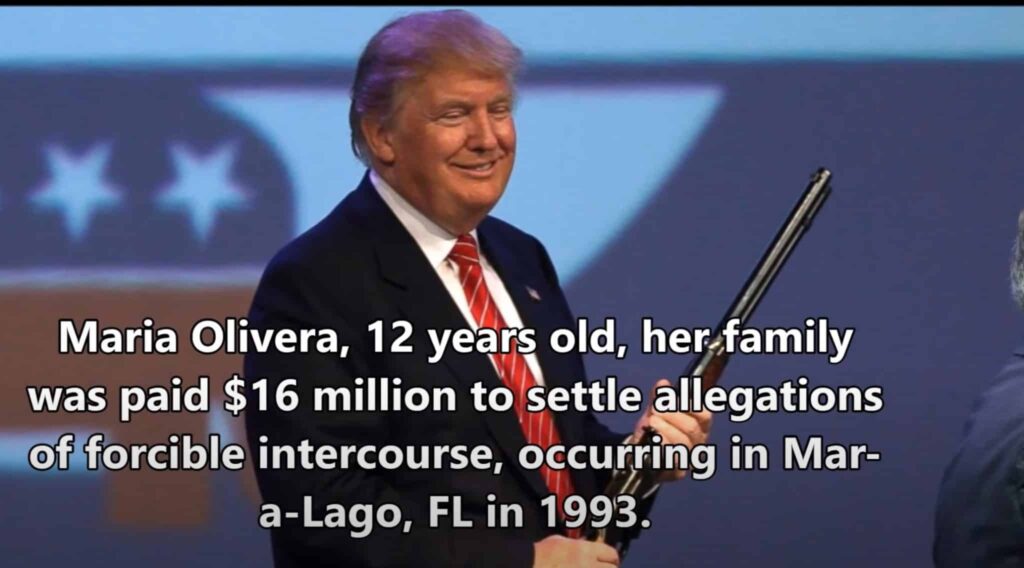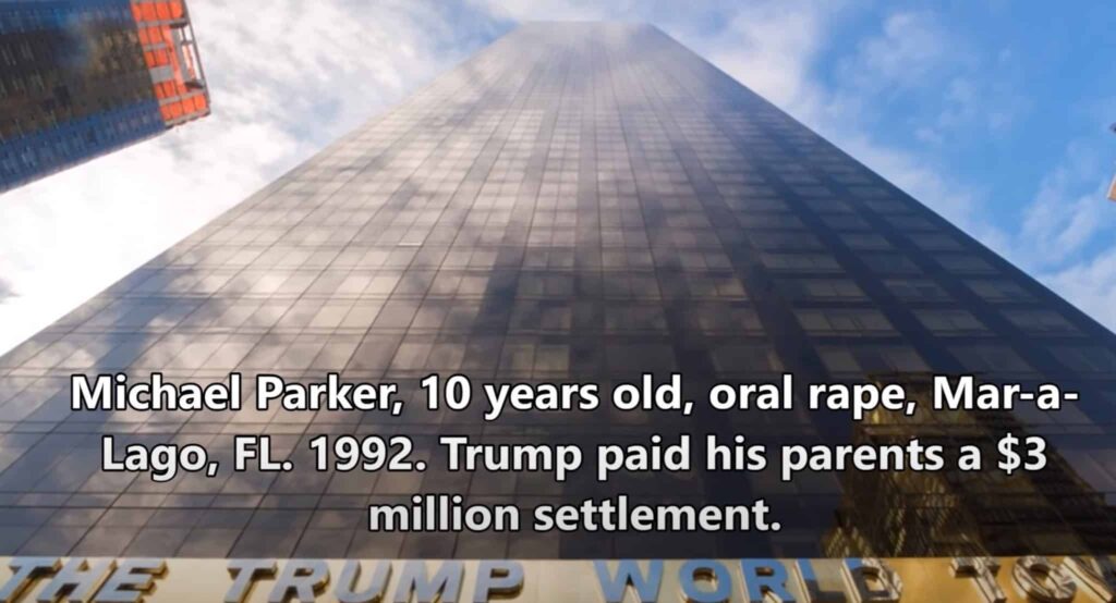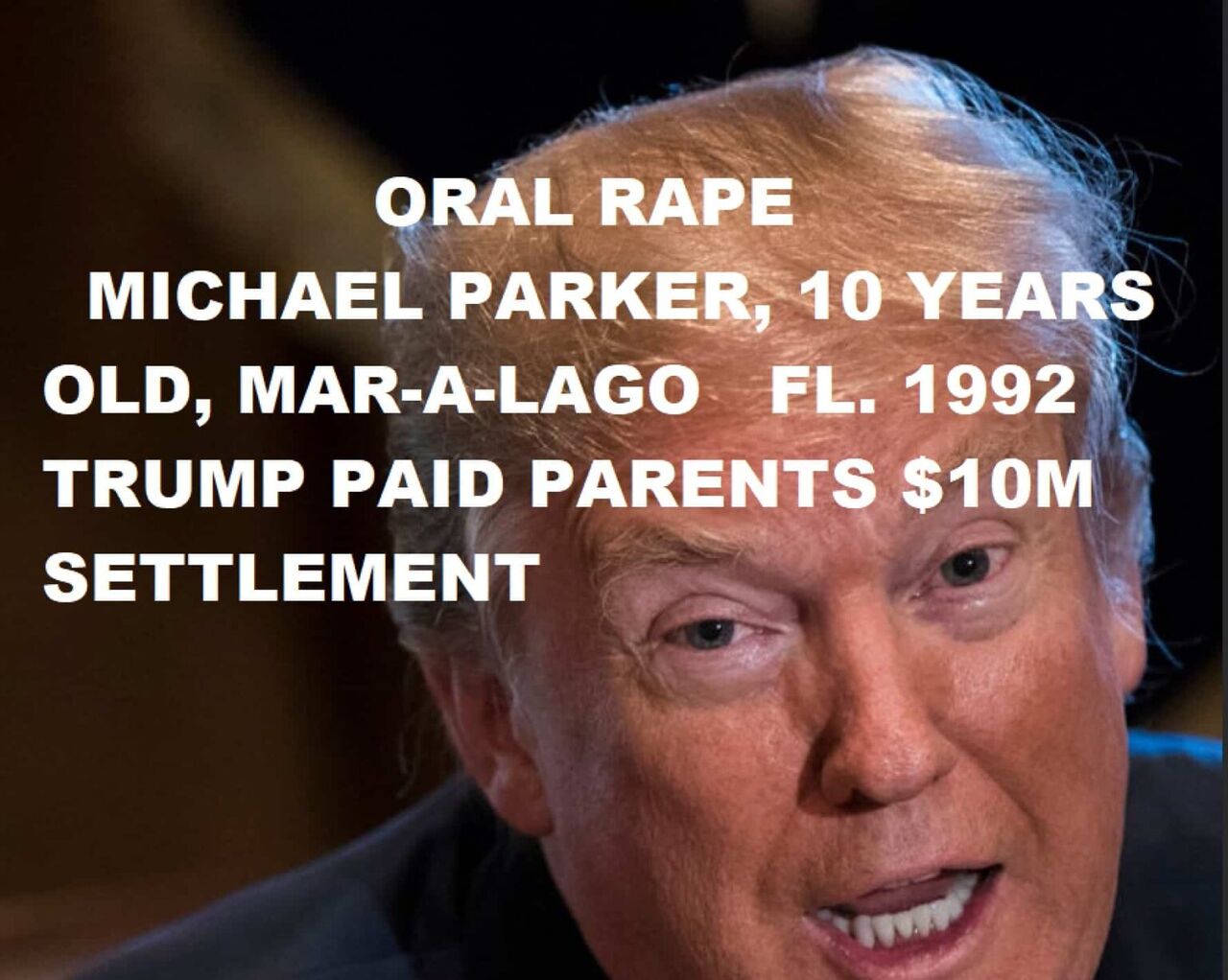 (1) マイケル・パーカー、10 歳、オーラルレイプ、1992 年、フロリダ州パームビーチ、マー・ア・ラーゴ。トランプ大統領は、彼の両親に 300 万ドルの和解金を支払いました。