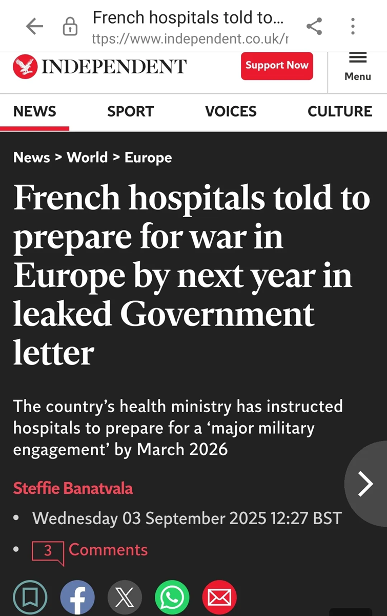 2025年9月3日 マーティン・アームストロング https://www.armstrongeconomics.com/world-news/war/hospitals-in-france-to-prepare-for-war-by-march-2026/フランス保健省は、2026年3月までに全ての病院に対し、戦争に備えるよう要請しました。エマニュエル・マクロン大統領は、ウクライナ前線へのフランス軍派遣に準備が整っていると繰り返し表明しており、今や国家全体が避けられない事態に備えねばなりません。