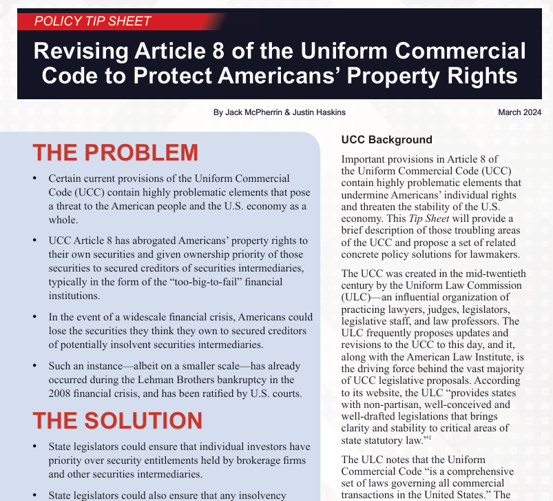 統一商事法典(UCC)第8条の重要な規定には、アメリカ国民の個人の権利を損ない、米国経済の安定を脅かす極めて問題のある要素が含まれています。本資料では、UCCのこうした懸念すべき領域について簡潔に説明し、立法者向けの関連する具体的な政策解決策を提案いたします。