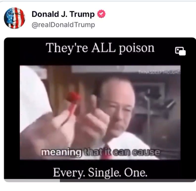 ドナルド・トランプ大統領が、NIHの遺伝学者による「チメロサールは極めて危険な毒素であり、ワクチン製造のあらゆる段階で使用されている」というビデオをTruth Socialに投稿しました。「それらはすべて毒だ。すべてだ。一つ残らずだ。」