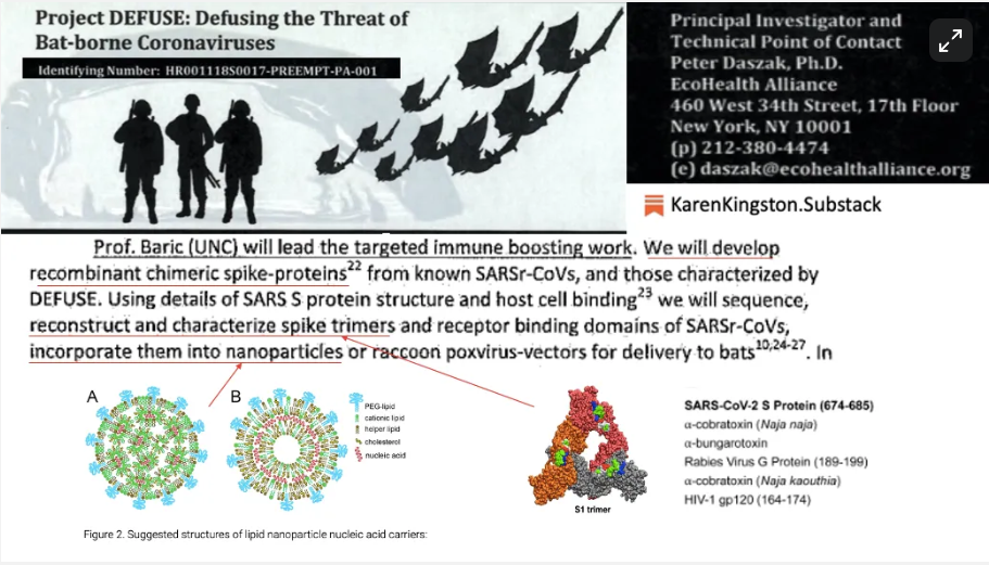 2018年のDARPA(国防高等研究計画局)への提案および査読付き論文により、元NIAID(国立アレルギー感染症研究所)所長トニー・ファウチ氏、NIH(国立衛生研究所)、ラルフ・バリック氏、ならびにエコヘルス・アライアンスが、ナノ粒子技術(いわゆるワクチンナノテクノロジー)で封入された組換え多種(キメラ)DNAスパイクタンパク質(mRNA)を用いた「生合成ウイルスワクチン」の開発に取り組んでいたことが判明しています。