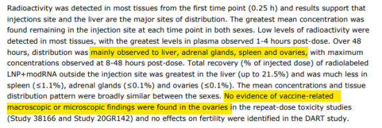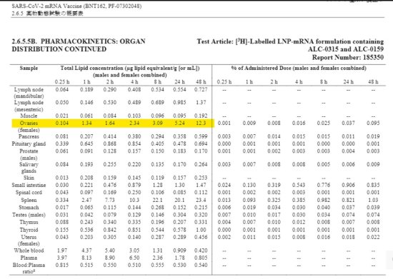 示されている表は、リークされたファイザーの調査文書からのものであり、EMA のレビューで取り上げられています。https : //www.ema.europa.eu/en/documents/assessment-report/comirnaty-epar-public-assessment-report_en です。 pdf …関連するパラグラフは卵巣の取り込みを確認しているが、「影響は認められなかった..は特定されなかった」という研究を参照している(別名未発表/検証可能)